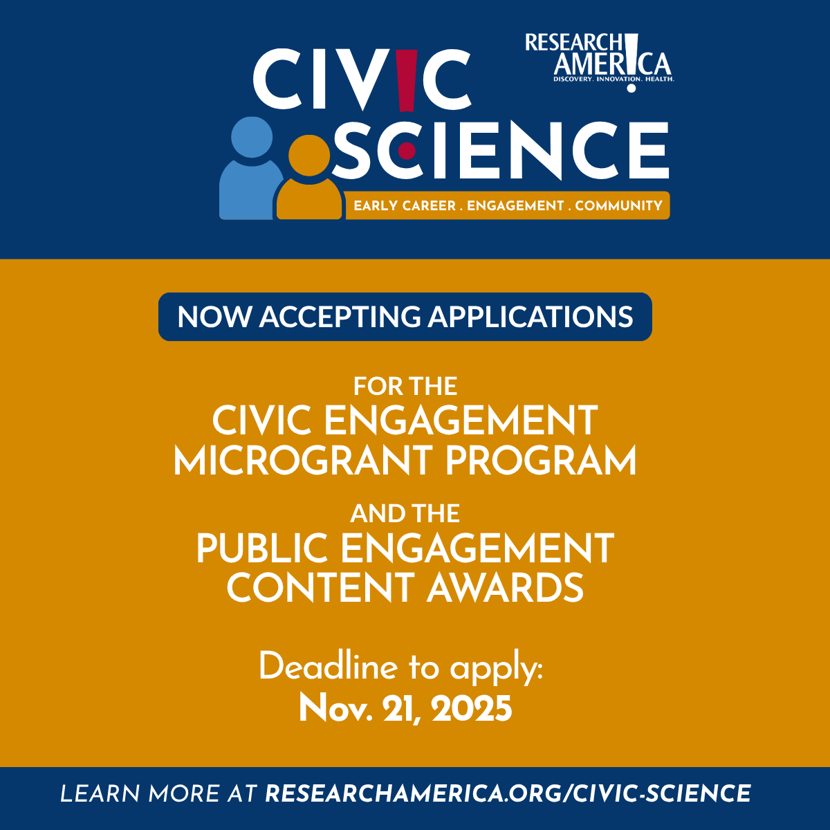 Civic Science Funding Opportunity: Power your public engagement with Research!America! We are accepting applications for the 2025-2026 cohort of our Civic Engagement Microgrant Program, which provides funding to groups led by STEMM post-docs, as well as graduate and professional students, for projects related to public engagement. Applications are also open for Public Engagement Content Awards that fund the development of open-access curricula designed to help researchers connect effectively with non-scientific audiences.