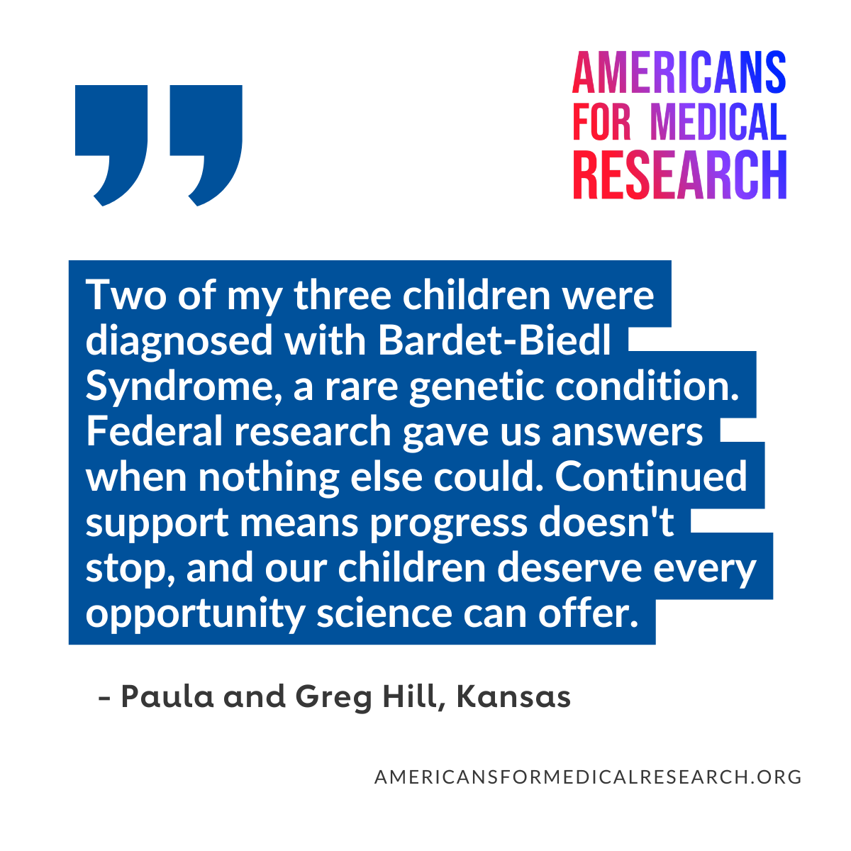 Elevating Voices in Support of Medical Research: The Americans for Medical Research campaign has been featuring stories from Americans across the country about why they support federally funded medical research. As Paula Hill, a parent in Kansas, says: “Two of my three children were diagnosed with Bardet-Biedl Syndrome, a rare genetic condition. Federal research gave us answers when nothing else could. Continued support means progress doesn’t stop, and our children deserve every opportunity science can offer.” (You can read more quotes and stories on the campaign website here.) Thanks to medical research, groundbreaking treatments and discoveries have saved lives and improved people’s quality of life. Americans are counting on continued progress for a healthier future.
